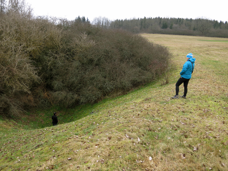 Tohle úžlabí nenechá v klidu žádného krasomila a tak se kocháme procházejíce od závrtu k závrtu. Po příchodu ke Křížovu závrtu nestačíme žasnout. Před námi je obraz jako z učebnice. Závěrová stěna a otevřené ústí vedoucí do hlubiny potěší jeskyňářské oko i ducha. Ani se nechce věřit, že něco takového je v krasu ještě k vidění, většinou jsou závrty zahliněné, nebo dno pokrývá materiál vytahaný při jejich otvírkách. Odtud pokračujeme až k Černému závrtu, kde se zájmem prohlížíme zařízení sloužící k tahání materiálu na povrch. Začíná být chladno a tak odcházíme kolem Malé dohody směrem k Holštejnu.
